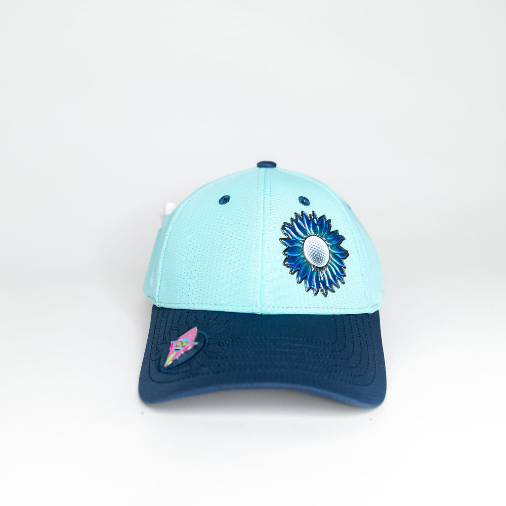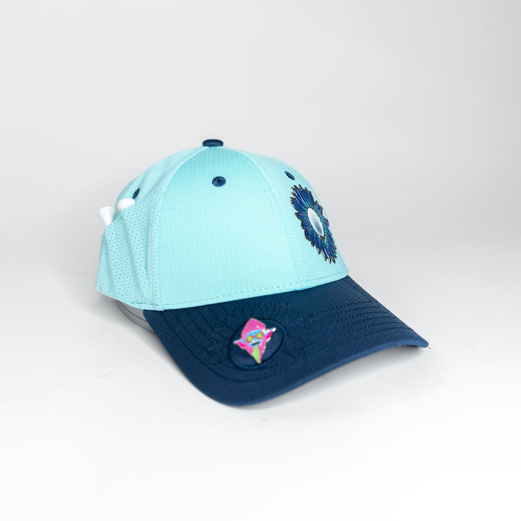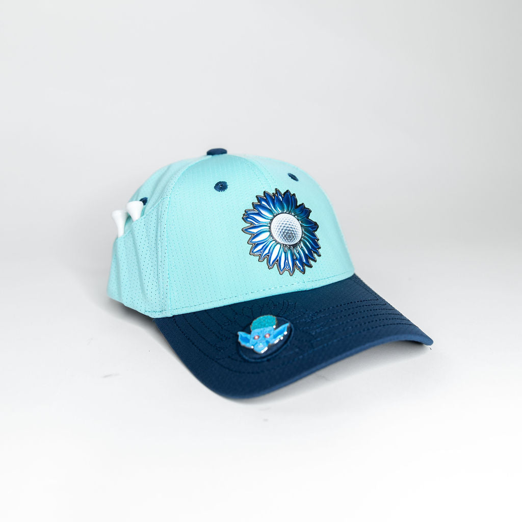 Person wearing a light blue cap with golf tees in the back.